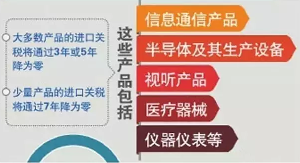 这些产品包括信息通信产品、半导体及其生产设备、视听产品、医疗器械、仪器仪表等,二手机械进口,其中大多数产品的进口关税将通过3年或5年降为零,少量产品的进口关税将通过7年降为零。